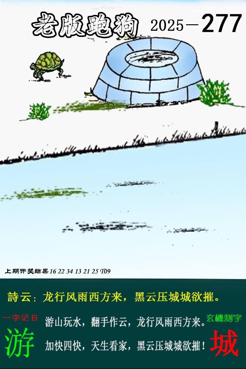 老版跑狗一字記之曰:【應】 詩云:红云飘影千秋歌,金鸡报在三更。而今重到,莺花應笑。红云飘影千秋歌。老眼黄尘,北潭涨雨。金鸡报在三更。玄機測字:《涨》
